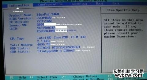 1、就我用的聯想Y460筆記本為例:開機時,按F2,進入BIOS菜單。首先進入的是計算機信息菜單欄,包括計算機型號、BIOS版本,以及CPU、內存、硬盤、光驅等主要硬件信息。相關信息如下圖: