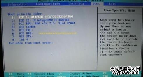 4、下圖是啟動項設置。系統默認的設置是USB KEY,這就是為什么在插上U盤等移動介質時,計算機無法啟動的原因所在。我們常用的啟動項只有幾種,一是硬盤啟,二是光驅啟動, 三是U盤量產啟動(USB CDROM),四是U盤軟啟動(USB HDD)。其它類型在實際應用中較少。因此我們需要對這些啟動項需要調整。