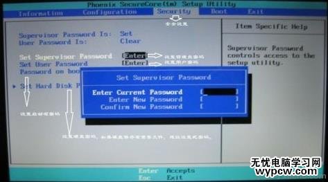 3、下圖是安全設置,包括超級用戶密碼和普通用戶密碼設置,以及啟動設置與硬盤密碼設置。相關設置如下圖所解。一般來說,我們只需設置管超級用戶密碼就行了。如果硬盤中保存有重要信息,也可以設置硬盤密碼。
