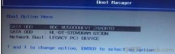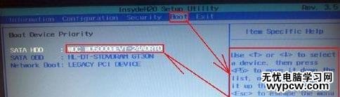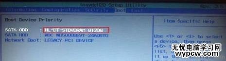 本文中的筆記本,設置方法是使用光標鍵定位,然后按F5鍵將選中項目向下移動,F6鍵將選中項目向上移動。因此,本文的設置方法為光標定位到第一個項目,即硬盤處,然后按F5鍵: