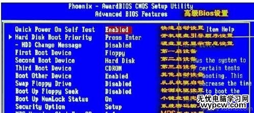 第二項為AdvancedBIOSFeatures(高級BIOS設置),也是我們今天重點介紹的對象,因為我們進入BIOS中一般就是為了設置它,再說的白點就是設置開機的第一啟動項,也就是我們平時裝系統的時候需要用到的,不管是U盤還是光盤裝系統。