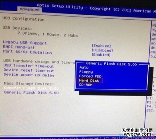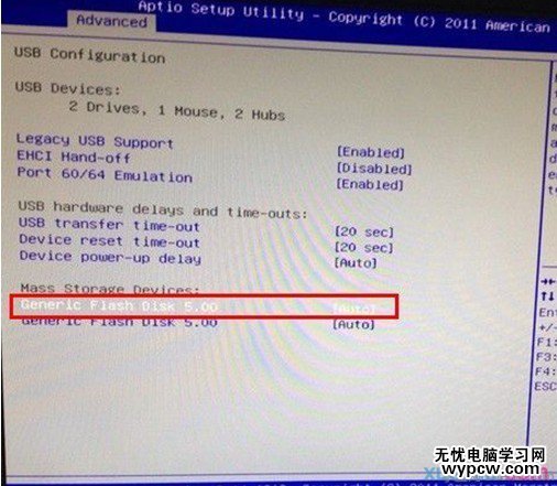 5.進入“USB Configguration”子界面,將光標(biāo)移動到“Generic Flash Disk 5.00”選項上,后面默認的選項是[Auto],這里我們需要更改這個選項,按下回車鍵。(如圖5)
