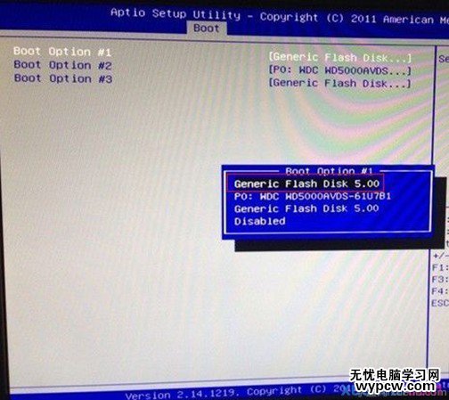 8.在該界面中選擇默認的第一個“Boot Option #1”,然后按回車鍵,彈出一個選擇的小窗口,不管里面有多少個選項,我們就選擇“Generic Flash Disk 5.00”按回車鍵即可。(如圖8)