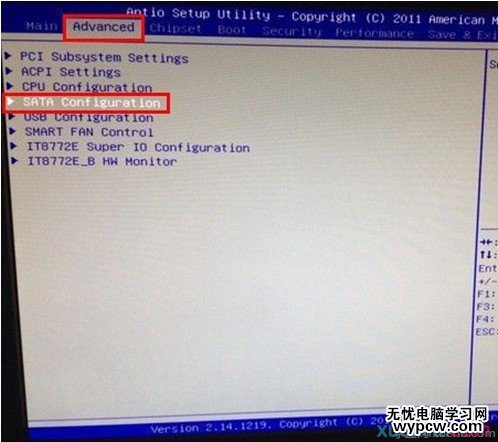 2.使用鍵盤左右方向鍵,將屏幕顯示的光標(biāo)移到到“Advanced”選項上,接著使用上下方向鍵,將光標(biāo)移到到“SATA Configuration”選項上按回車鍵。(如圖2)