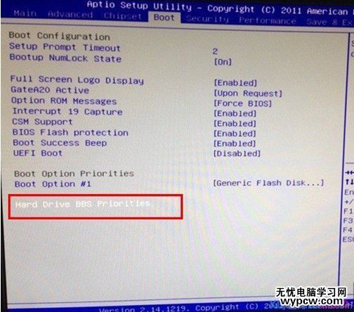 7.以上設(shè)置都操作完畢以后,我們接下來將設(shè)置BIOS第一啟動項為U盤啟動,按“ESC”鍵后退到BIOS設(shè)置主界面,然后按左右方向鍵將光標(biāo)移動到“BOOT”選項,然后按上下方向鍵將光標(biāo)移動到“Hard Drive BBS Priorities”選項,按回車鍵進入。(如圖7)
