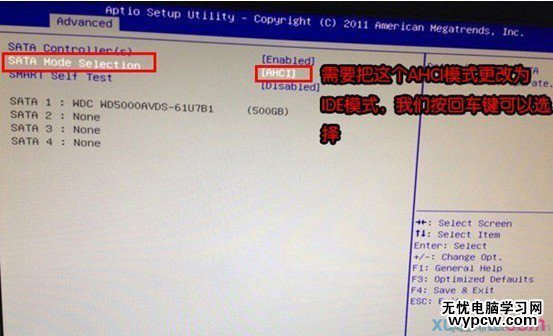 3.接著進入到“SATA Configuration”子界面,將光標(biāo)移動到“SATA Mode Selection”選項上,這里我們需要將AHCI硬盤模式更改為IDE模式即可。(如圖3)