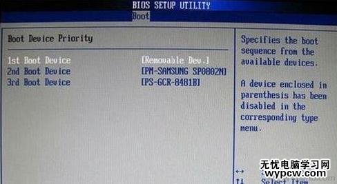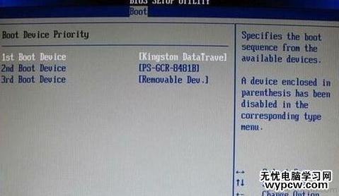 如果在圖1-2的硬盤驅動器“Hard Disk Drives”里面沒有將U盤作為第一啟動設備,那么,在這里就不會存在和顯示U盤,如上圖2-2所示。但是,我們可以選擇移動設備“Removable Dev.”來作為第一啟動設備
