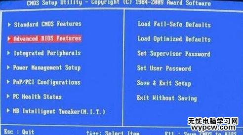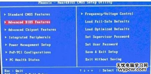 3開機時按住Del鍵進入到該電腦的BIOS設置界面,選擇高級BIOS設置Advanced BIOS Features。