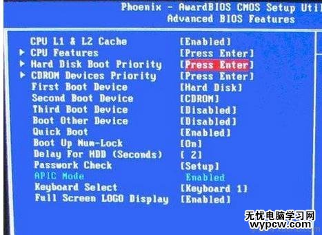 在高級BIOS設置(Advanced BIOS Features)的界面,首先要選擇硬盤啟動優先級:Hard Disk Boot Priority
