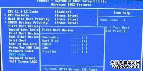 完成上一步后,再選擇第一啟動設備(First Boot Device):該版本的BIOS這里沒有U盤的“USB-HDD”、“USB-ZIP”同類的選項,選擇移動設備“Removable”也不能正常啟動。但是,選擇“Hard Disk”就可以啟動電腦。