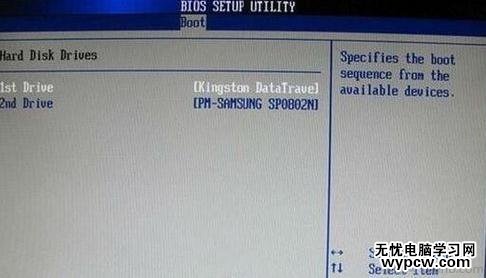 進入硬盤驅動器“Hard Disk Drives”界面,需要選擇U盤作為第一啟動設備“1st Drive”。如果之前在“Hard Disk Drives”里已經選擇U盤為第一啟動設備,如圖3-2所示,那么在這個界面里就會顯示有U盤,我們就可以選擇U盤作為第一啟動設備