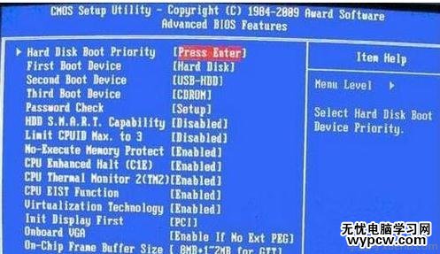 在進入高級BIOS設置(Advanced BIOS Features)界面后,首先要選擇硬盤啟動優先級:Hard Disk Boot Priority。