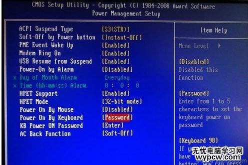 進(jìn)入Power Management Setup 后看到如下界面,就Power On By Keyboard 設(shè)置成PassWord