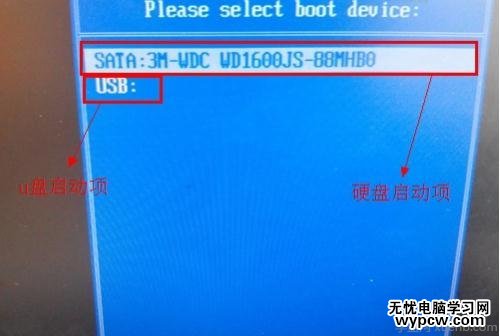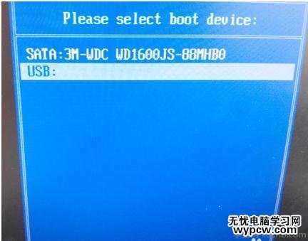 現在我們將光標移動到顯示“USB”的地方,如下圖所示:(小編寫這篇教程的時候使用的是u盤),所以,當我們按下快速熱鍵F11的時候顯示出來的選項中就包含有小編用u大俠制作好啟動盤的u盤。
