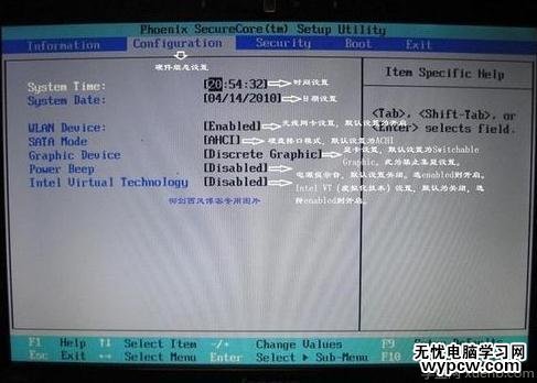 2、下圖是硬件組態設置。主要包括:時間、日期設置,無線網卡、硬盤接口模式、顯卡、電耗提示音、因特爾虛擬化技術等設置。相關詳細設置如下圖(圖中把AHCI寫成ACHI了,特此更正):