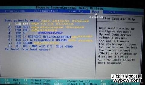 3、下圖是啟動項設置。系統默認的設置是USB KEY,這就是為什么在插上U盤等移動介質時,計算機無法啟動的原因所在。我們常用的啟動項只有幾種,一是硬盤啟,二是光驅啟動,三是U盤量產啟動,四是U盤軟啟動。我們可以對這些啟動項進行相應的調整。