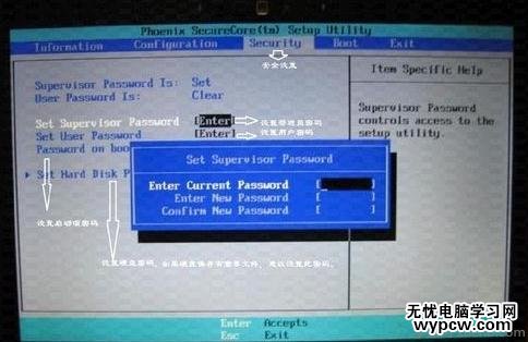 5、下圖是安全設(shè)置,包括超級用戶密碼和普通用戶密碼設(shè)置,以及啟動設(shè)置與硬盤密碼設(shè)置。相關(guān)設(shè)置如下圖所解。一般來說,我們只需設(shè)置管超級用戶密碼就行了。如果硬盤中保存有重要信息,也可以設(shè)置硬盤密碼。