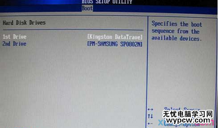 如果先在“Hard Disk Drives”里面選擇U盤為第一啟動設備,如圖3所示,那么這里就會顯示有U盤,那就選擇U盤為第一啟動設備,如圖4所示。
