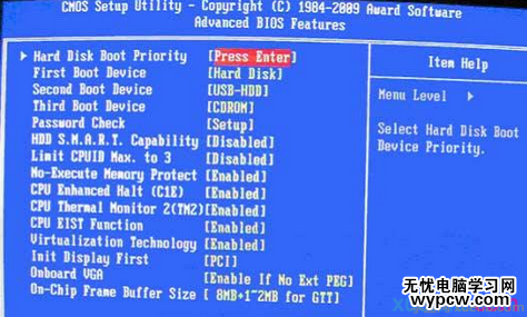 上圖2:高級BIOS設置(Advanced BIOS Features)界面,首先選擇硬盤啟動優先級:Hard Disk Boot Priority