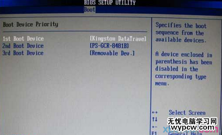 上圖10 :啟動優先級設備選擇(Boot Device Priority)在第一啟動設備(1st Boot Device)里選擇U盤