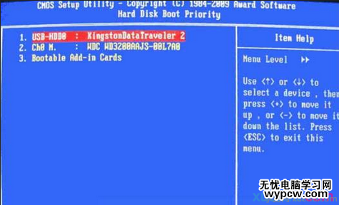 上圖7:硬盤啟動優先級(Hard Disk Boot Priority)選擇:使用小鍵盤上的加減號“+、-”來選擇與移動設備,將U盤選擇在最上面。然后,按ESC鍵退出,回到圖2的設置界面。