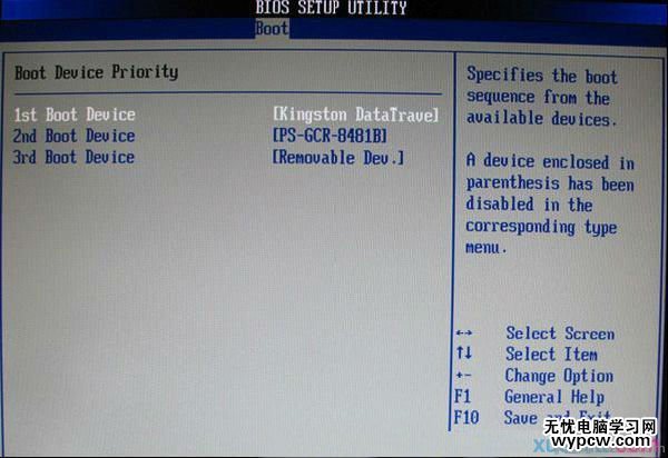 如果在圖1-2的硬盤驅(qū)動(dòng)器“Hard Disk Drives”里面還沒(méi)選擇U盤為第一啟動(dòng)設(shè)備,那么這里就不存在和顯示U盤,如上圖2-2所示,但可以選擇移動(dòng)設(shè)備“Removable Dev.”作為第一啟動(dòng)設(shè)備;