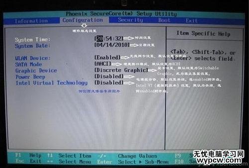 2、下圖是硬件組態設置。主要包括:時間、日期設置,無線網卡、硬盤接口模式、顯卡、電耗提示音、因特爾虛擬化技術等設置。相關詳細設置如下圖(圖中把AHCI寫成ACHI了,特此更正):