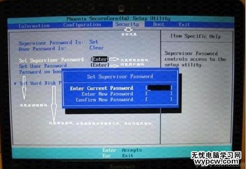 5、下圖是安全設置,包括超級用戶密碼和普通用戶密碼設置,以及啟動設置與硬盤密碼設置。相關設置如下圖所解。一般來說,我們只需設置管超級用戶密碼就行了。如果硬盤中保存有重要信息,也可以設置硬盤密碼。