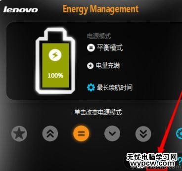 接下來,在打開的聯想電源管理軟件中點擊如下圖所示位置的設置按鈕,打開設置??赡苡械耐瑢W的電腦系統中的聯想電源管理軟件和下圖所示的不一樣,但是原理基本上是一致的。