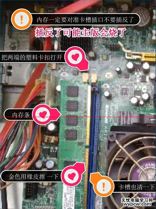 5、獨立顯卡重新撥插一下,也不可以的話,把內存條也重新撥插一下(隨便也內存條的金手指用橡皮擦一下),內存一定要對準卡槽插口不要插反了,插反了主板就會燒廢了