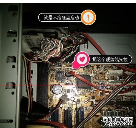 8、換上連線也不行,弄了大半天了,這下暈了!后面仔細看一看,想一想會不會是電腦檢測不到一些配件(硬件)呢??????(這個要重點注意),發現鍵盤燈都沒亮(鍵盤是好的),電腦是集成的顯卡又不能撥插,怎么樣都能使電腦重新檢測硬件呢?問題找到了就好辦了,我們可以把電腦的硬盤線撥了(就是不接硬盤啟動),因為電腦沒有硬盤就會重新檢測硬件的(這個要重點注意)