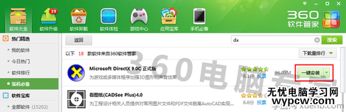 方案二:安裝Directx。打開360軟件管家,在搜索框中搜索“dx”下載“microsoft directx”按照提示安裝即可。