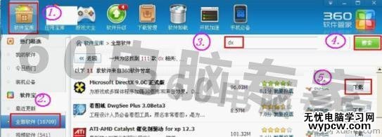 1. 打開【360安全衛(wèi)士】,點(diǎn)擊【360軟件管家】,在搜索框中搜索【dx】下載【microsoft directx】按照提示安裝即可。(如圖5、6)