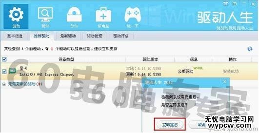 2. 運(yùn)行【驅(qū)動(dòng)人生】選擇【推薦驅(qū)動(dòng)】,在下面的列表中找到顯卡將前面的框框打√,然后點(diǎn)擊【一鍵更新】,驅(qū)動(dòng)更新完成后按照提示點(diǎn)擊【立即重啟】,電腦重啟后驅(qū)動(dòng)更新完成。(如圖3、4)