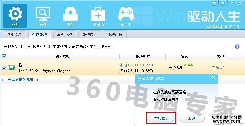 3. 運行【驅動人生】選擇【推薦驅動】,在下面的列表中找到【顯卡】(其它設備,就點擊相應設備即可)將前面的框框打【√】,然后點擊【一鍵更新】,驅動更新完成后按照提示點擊立即重啟,電腦重啟后驅動更新完成。(如圖4,5)