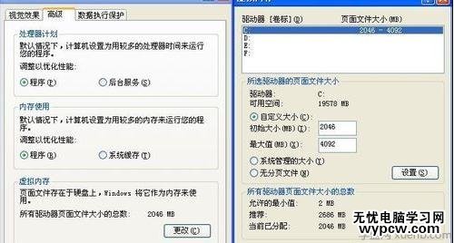 右鍵我的電腦——屬性——高級——性能 設置——高級——虛擬內存 更改