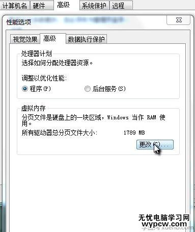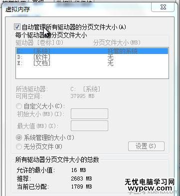 如果沒有設置windows虛擬內存,那么很容易收到“內存不足”的消息。Win7: 點擊 控制面板——系統——高級系統設置。在“系統屬性”對話框中,單擊“性能”選項卡設置,然后點擊"高級"。在"虛擬內存"設置中,選擇“自動管理所有驅動器的分頁文件大小”選項,將計算機中可作為虛擬內存使用的硬盤空間量設置為默認值。