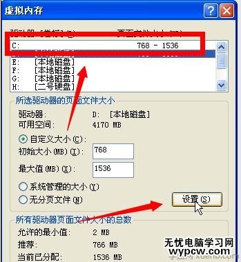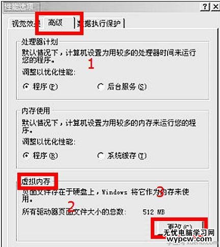 2.釋放磁盤空間,轉移虛擬內存,我的電腦-屬性-高級-性能-設置-高級 更改,選擇D或E-自定義-添加原C盤數值-設置