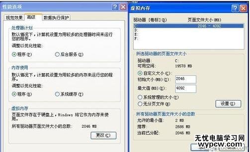 在性能選項選擇高級,點擊更改虛擬內存選項,設置虛擬內存放置的硬盤分區,放C盤是最好的。接著設置初始值和最大值,初始值可以設置為物理內存的1.5倍,最大值可以設置為內存的3倍。