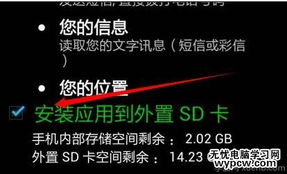 2,加好內存卡后,我們重啟一下手機,這樣內存卡才能正常的讀取,然后安裝軟件的時候,我們需要注意一下,會有一個安裝軟件至SD卡,勾選好之后再去安裝