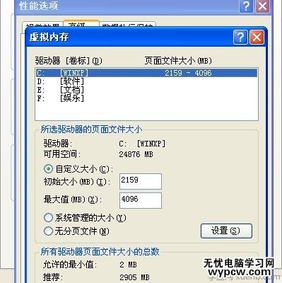 2.釋放磁盤空間,轉移虛擬內存,我的電腦-屬性-高級-性能-設置-高級 更改,選擇D或E-自定義-添加原C盤數值-設置