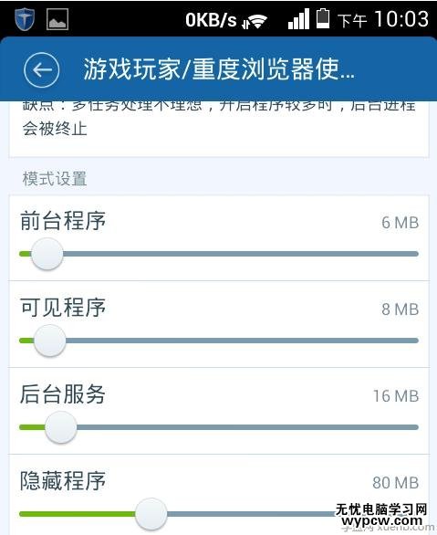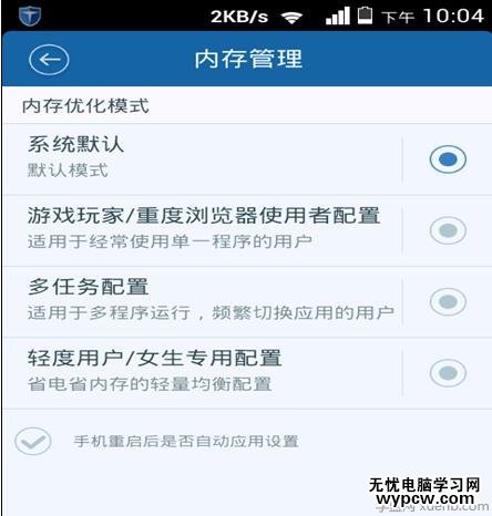 內(nèi)存管理里面包括系統(tǒng)默認(rèn),游戲重度瀏覽器使用者配置,多任務(wù)配置,輕度用戶。大家可以根據(jù)自己平時的使用習(xí)慣來選擇哪種內(nèi)存清理方案。