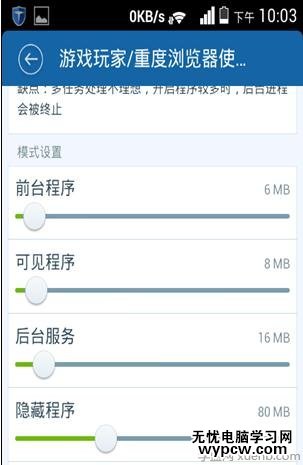 內存管理里面包括系統默認,游戲重度瀏覽器使用者配置,多任務配置,輕度用戶。大家可以根據自己平時的使用習慣來選擇哪種內存清理方案。