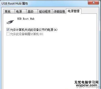 3、雙擊USB Root Hub選項,在打開屬性對話框,切換到“電源管理”,將“允許計算機關閉這個設備以節約電源”選項取消后按“確定”按鈕即可;如下圖所示: