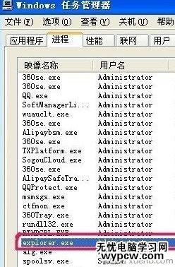 2、在進程中找到"explorer.exe"這個進程單擊一下,然后按"結束進程"按鈕,這時候桌面都沒了,不要害怕,看下一步。