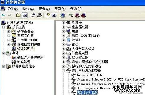 如果更換USB接口還有更換鼠標仍然不能解決問題的話,有可能是USB端口供電不足所致。我們右擊我的電腦,然后選擇管理,找到設備管理器,然后展開“通用串行總線控制器”選項,找到USB Root Hub選項。