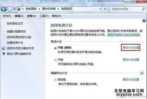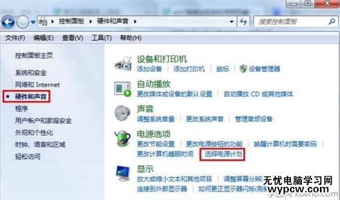 4、打開控制面板后,點擊“硬件和聲音”,接著點擊“選擇電源計劃”