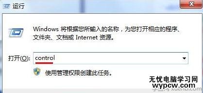 3、在隨后打開的窗口中輸入“control”,回車確定