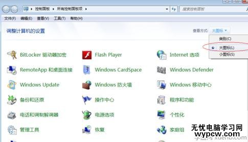 將【控制面板】右上角的查看方式更改為【大圖標(biāo)】;