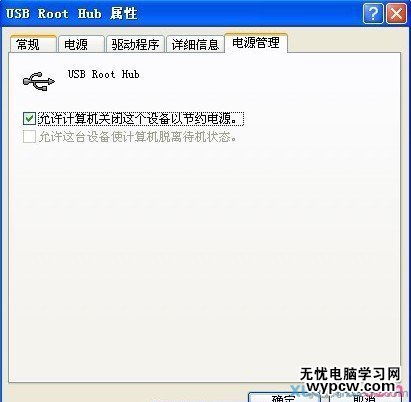 第三步:在USB ROOT HUB屬性界面的電源管理那一欄下面找到“允許計算機關閉這個設備以節約電源”這一項,把勾給去掉,然后選擇確定就行了。